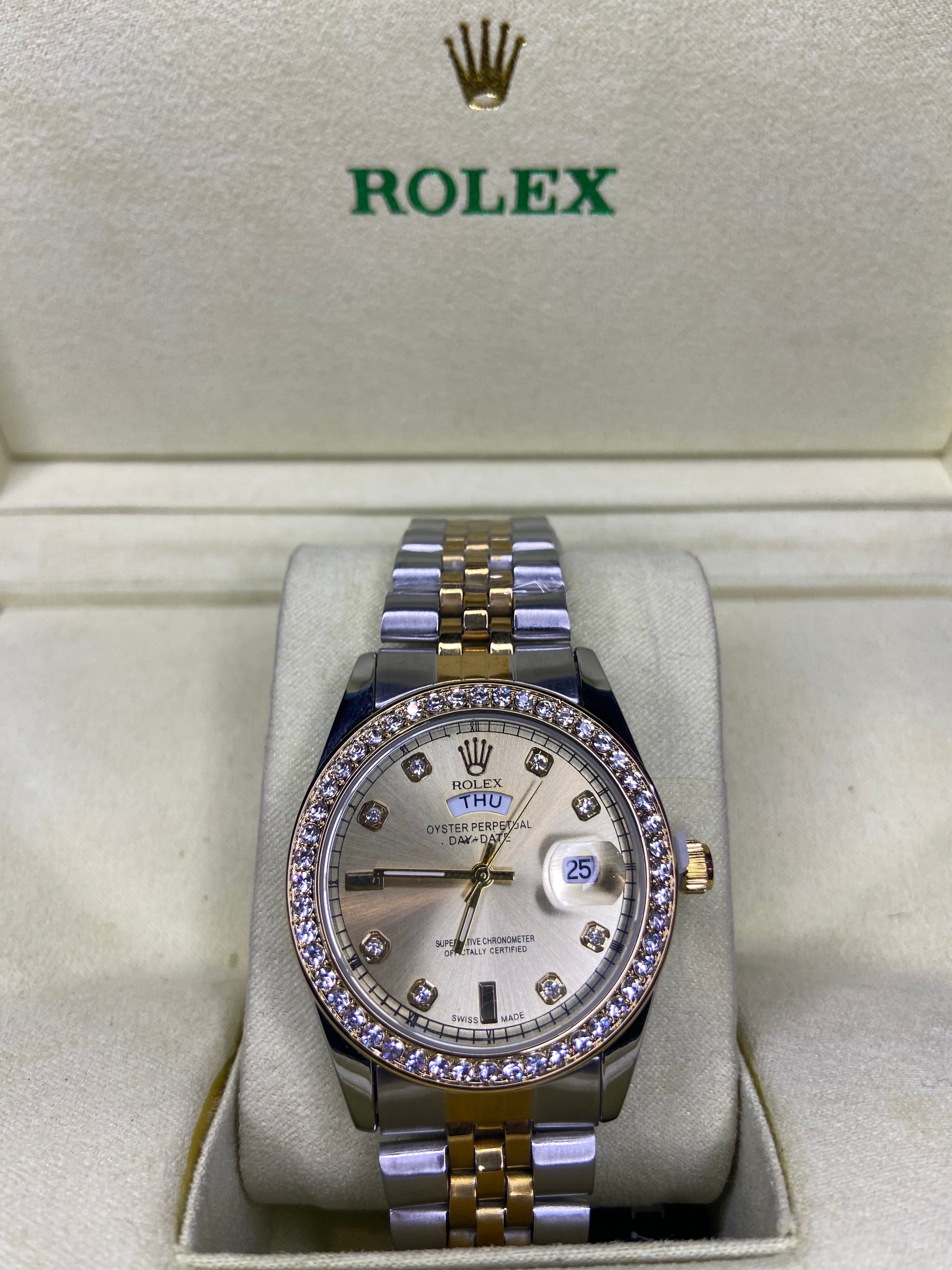 This two-tone silver edition features a beautifully brushed sunburst dial, diamond hour markers, and displays both the day and date functions — a signature feature of the Day-Date series. Perfectly blending stainless steel and gold, this timepiece defines luxury that never fades.