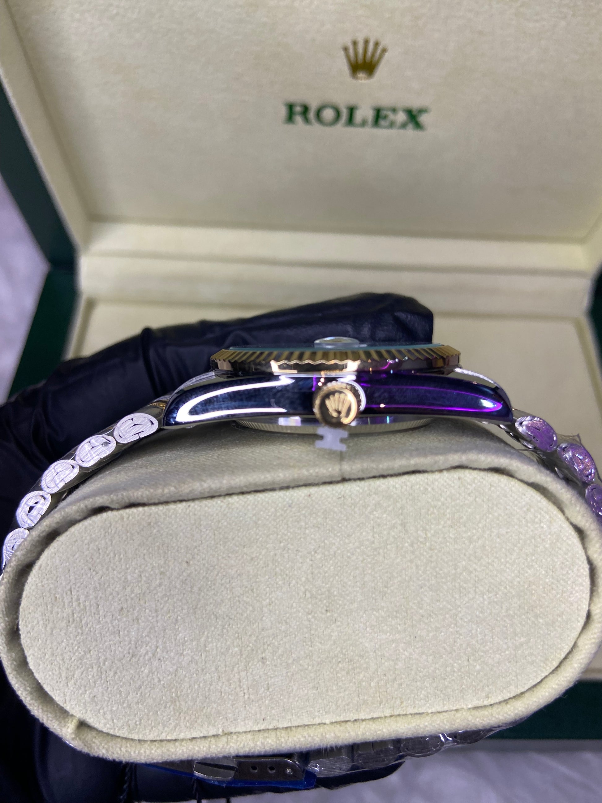 This two-tone silver edition features a beautifully brushed sunburst dial, diamond hour markers, and displays both the day and date functions — a signature feature of the Day-Date series. Perfectly blending stainless steel and gold, this timepiece defines luxury that never fades.